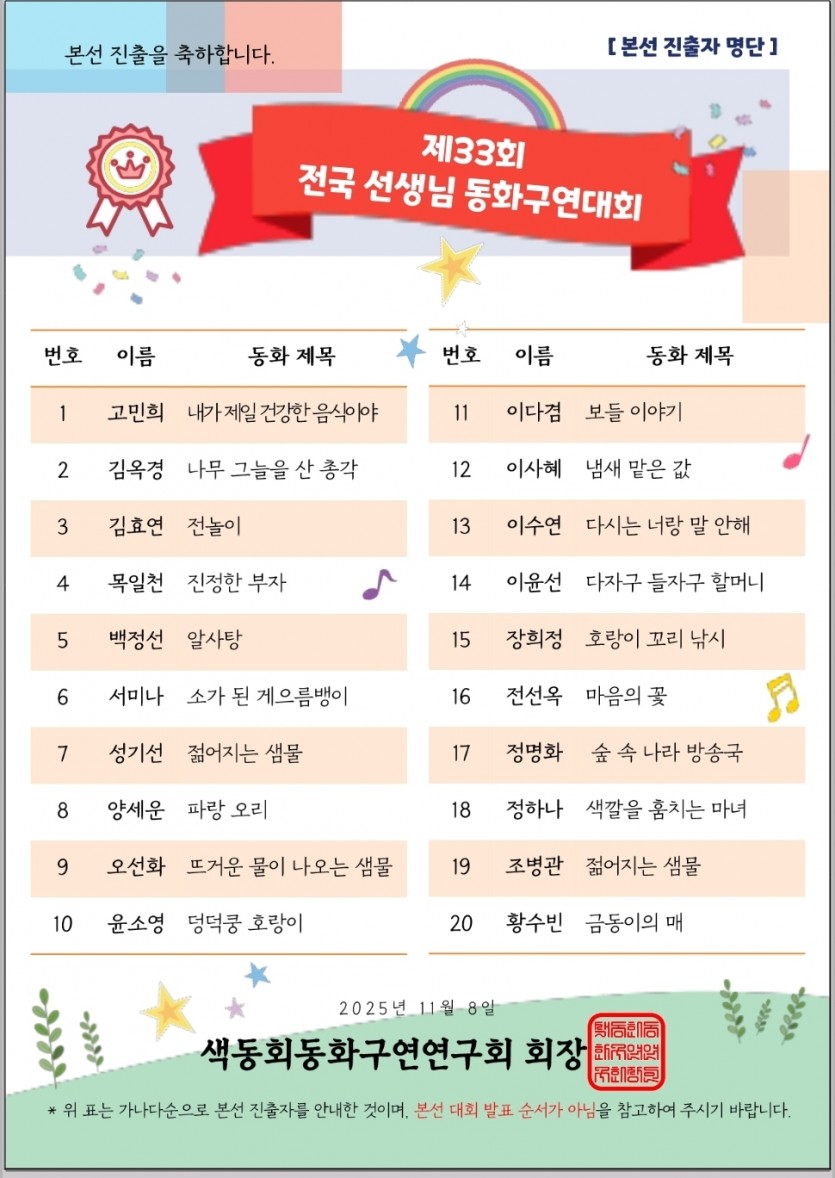 제33회 전국 선생님 동화구연대회 본선 진출자 안내